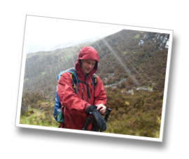 The highlight of today was our visit to the Blackburn bothy which was staffed by two fellows from an MBA work crew. Iain and Neil were very friendly and greeted us with the offer of tea, coffee and biscuits. They even provided seating outside the bothy. They’d come up for the weekend to work on a planned extension to the bothy and had decided to stay on since the weather was so good. Iain and Neil were being assisted by Jock, a very cute young Border Collie.